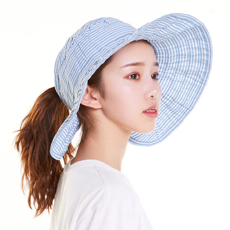 معرض من عكسها أعلى فارغة النساء قبعة الشمس واسعة حافة قناع شاطئ كاب السيدات قبعات صيفية النساء الشاطئ مخطط عارضة طوي قبعات الشمس