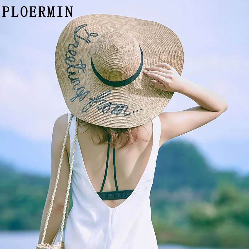صور ل 2019 الصيف كبيرة حافة قبعات للحماية من الشمس للنساء الأزياء الترتر إلكتروني لا تخل التطريز مطوية قبعة مرنة بوهيميا شاطئ كاب