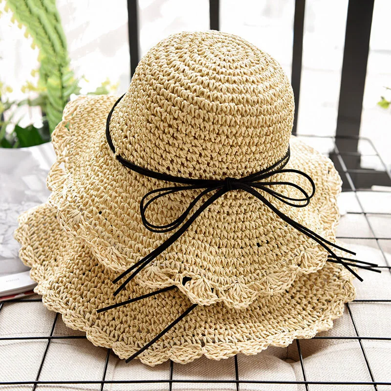 معرض ل جديد الفتيات والفتيان يدوية قبعة الشمس الاطفال قبعة صيفية من القش كبير الجناح شاطئ كاب طوي تنفس الصيف الوالدين والطفل قبعة