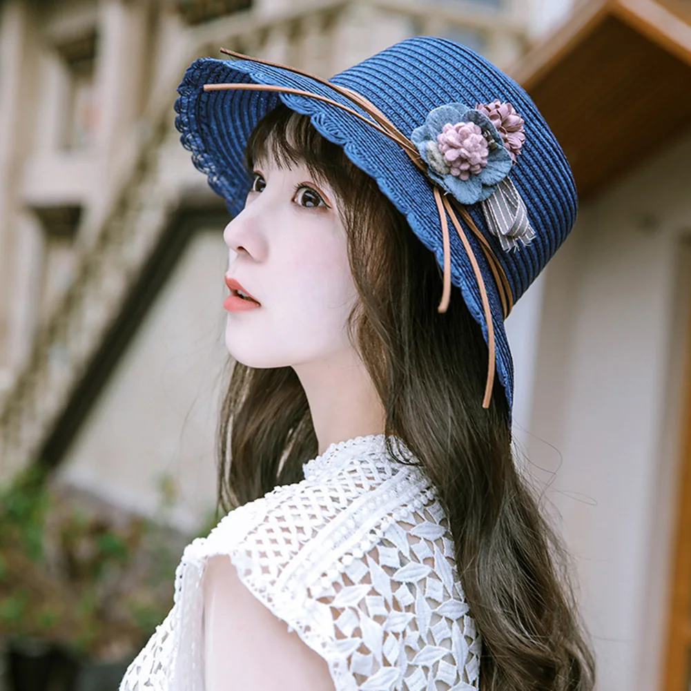 صور من النساء هدية في الهواء الطلق طوي شاطئ كاب بسيطة الأشعة فوق البنفسجية حماية الجانب زهرة الحواف القش الصيف ظلة قبعة الشمس عارضة الأزياء
