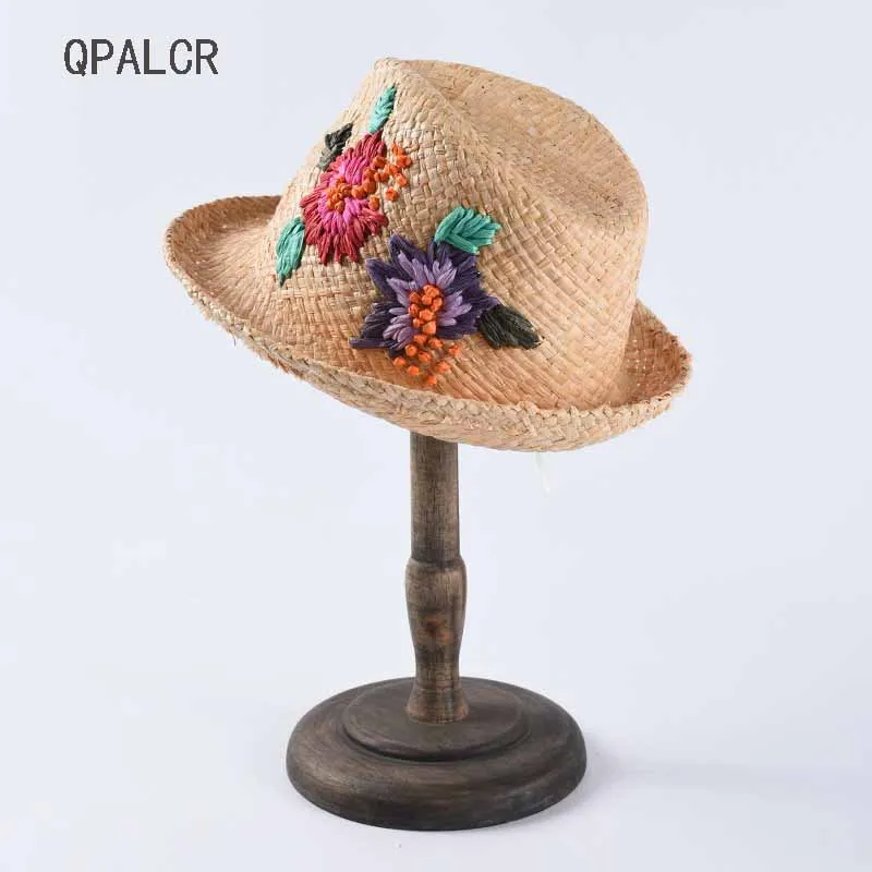 صور من QPALCR 2019 النساء قبعات من القش بنما قبعة للوقاية من الشمس اليدوية الرافية الكرتون الأزهار التطريز واسعة حافة قبعة للشاطئ الأزياء الجاز كاب