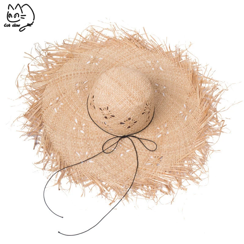 المنتجات ذات الصلة ل Beach Caps و اليدوية نسج 100% الرافية قبعات للحماية من الشمس للنساء شريط أسود الدانتيل يصل كبيرة حافة القش قبعة في الهواء الطلق شاطئ الصيف قبعات Chapeu Feminino
