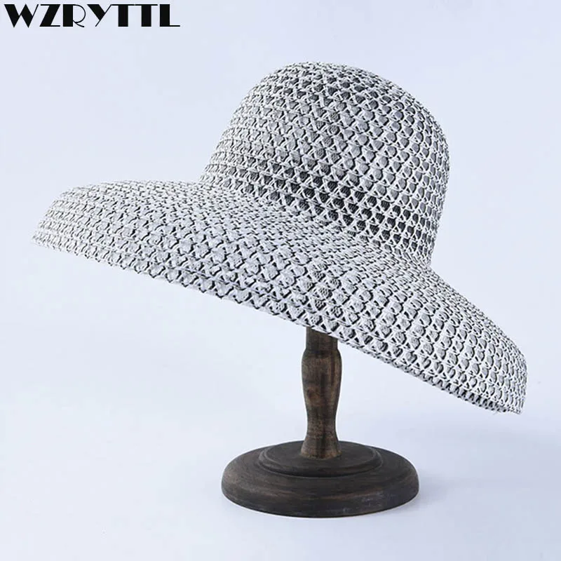 PZZY JGDD المرأة قبعة صيفية من القش اليدوية القش النسيج موجة نقطة وشاح قبعات للحماية من الشمس كبيرة واسعة حافة الشاطئ قبعة طوي بنما قبعات