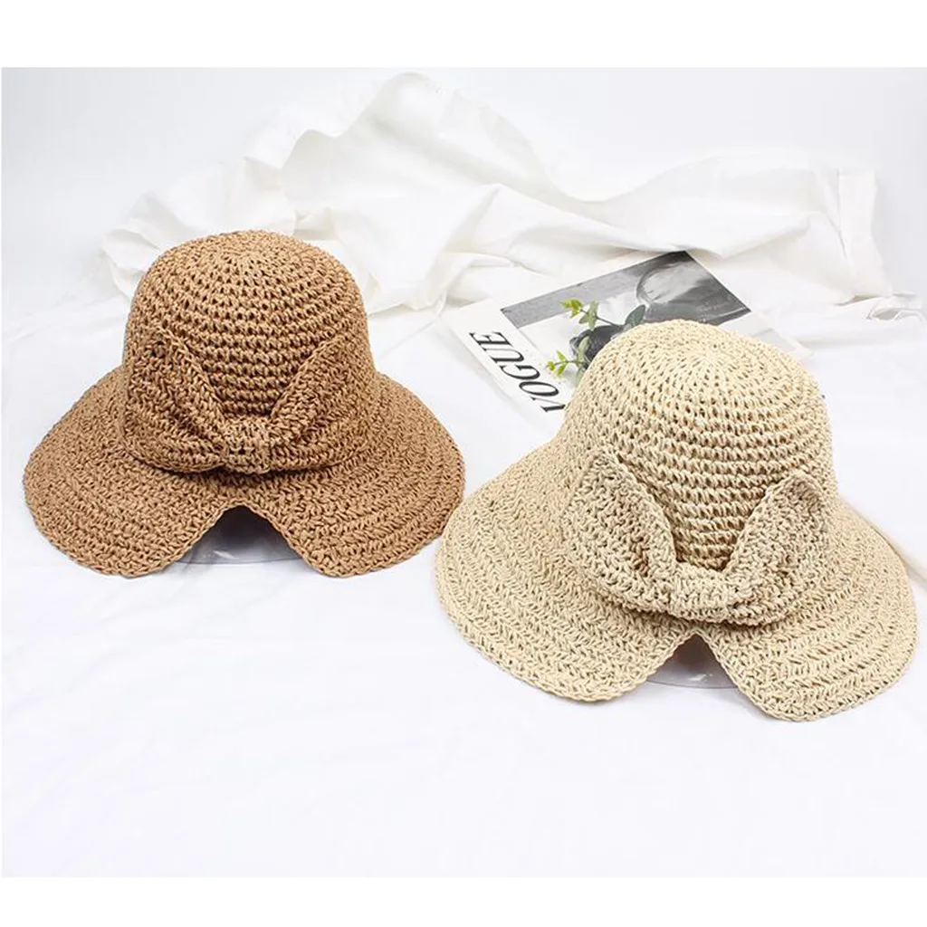 شراءمعلومات اضافية السيدات الصيف خفيفة الوزن تنفس قبعات الشمس 1x النساء Bowknot سترو قبعة شريط مرن طوي نشمر شاطئ كاب قبعة الشمس Z425