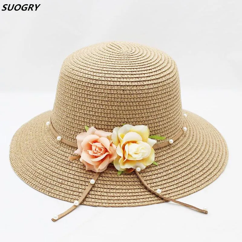 [DINGDNSHOW] 2019 الأزياء قبعة الشمس طفل زهرة شاطئ كاب روز قبعة صيفية لفتاة القش قبعة واسعة حافة الأطفال قبعة