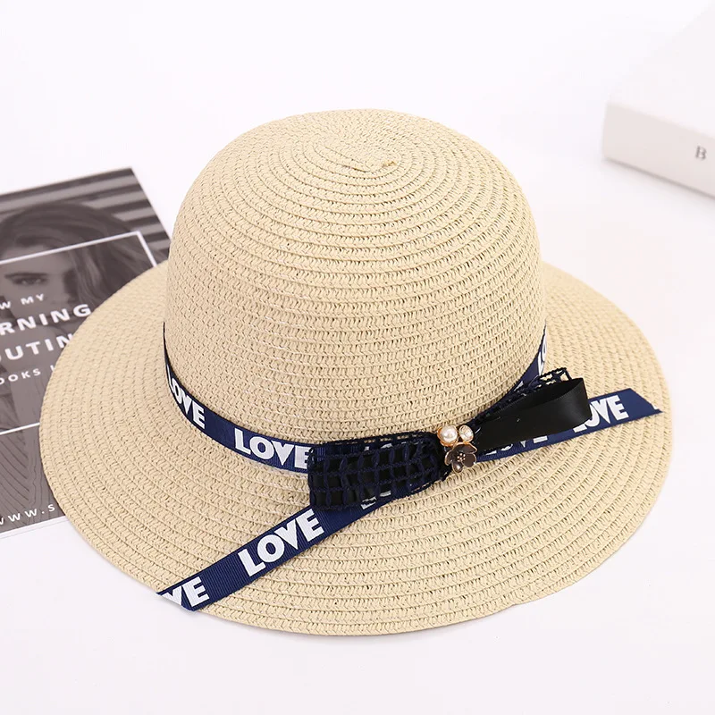 معرض ل سيدة القش قبعة الإناث الربيع الصيف شاطىء البحر شاطئ قبعات واقية من الشمس قبعات للحماية من الشمس الفتيات السفر ظلة قبعة واسعة حافة ضبط A147