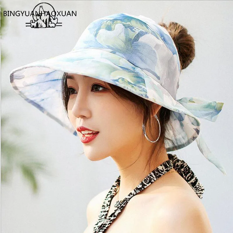 معرض ل BINGYUANXUAN واسعة حافة قبعات صيفية للنساء الشمس بنما عكسها الأشعة فوق البنفسجية حماية الزهور شاطئ كاب سمبريرو قناع