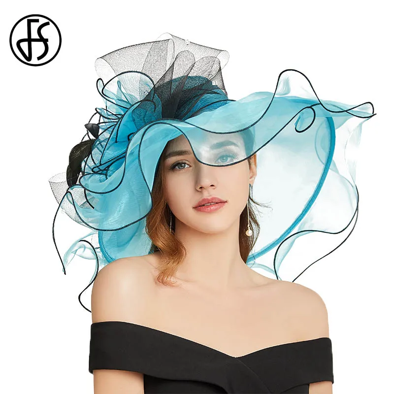 معرض من FS أنيقة الصيف قبعات للحماية من الشمس للنساء الشاي حزب الأورجانزا زهرة الشاطئ قبعة واسعة حافة السيدات الكنيسة اللباس كنتاكي ديربي فيدورا