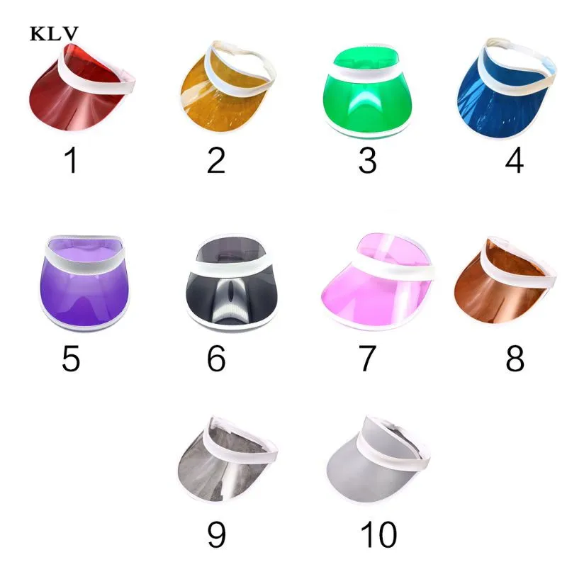 معرض ل KLV النساء الرجال شفافة PVC البلاستيك ظلة قبعة متجمد الحلو الحلوى اللون فارغة مكشوفة الرياضة الشاطئ قبّعة للوقاية من الشّمس حزام الظهر