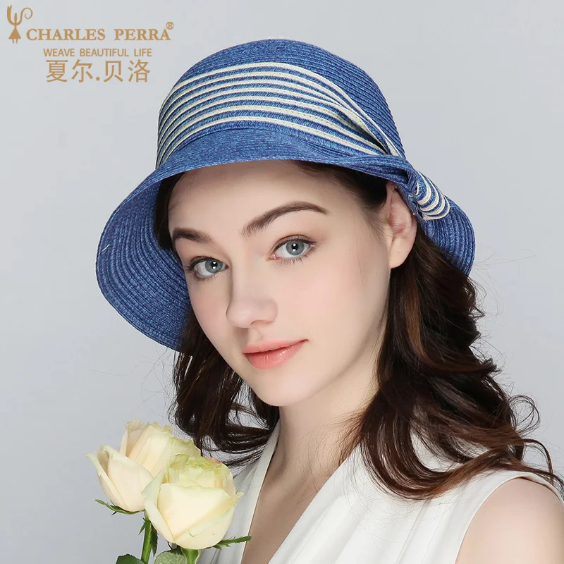 صور من تشارلز perra الشمس القبعات النسائية الصيف جديد طوي الشمس مخطط القش الشاطئ سيدة قبعات قبعة الأزياء الأنيقة 6535