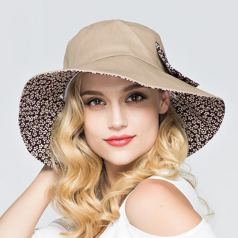 صور ل 4 اللون سيدة الأشعة فوق البنفسجية واقية من الشمس الشمس قبعة سيدة الشمس قبعة واسعة حافة الشاطئ القطن كاب القبعة الزهور Bowknot شاطئ كاب عالية الجو...