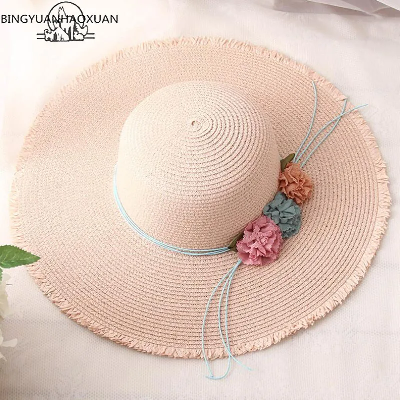 المنتجات ذات الصلة ل Beach Caps و BINGYUANHAOXUAN 2018 الساخن كبيرة حافة قبعات للحماية من الشمس ل الوالدين والطفل نماذج قبعة قش قابلة للطي الإناث عارضة أومبير قبعة صيفية شاطئ كاب