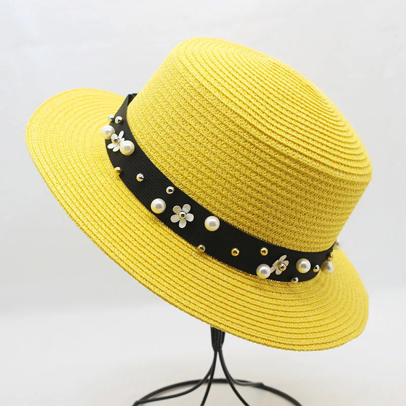 صور ل النساء الشاطئ قبعات الشمس قبعة واقية القش قبعات من الألياف المجدولة لسيدة أنيقة اللؤلؤ قبعة الشمس واسعة حافة الصيف قبعة صغير ة من القش Chapeu