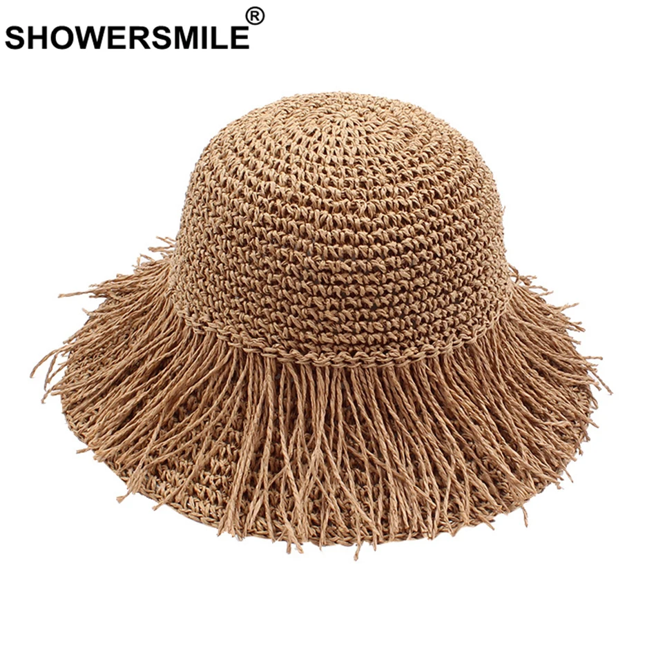شراءمعلومات اضافية SHOWERSMILE القش قبعة بحافة النساء طوي هامش قبعة الإناث القهوة الكروشيه عطلة ظلة عارضة السيدات الصيف الشاطئ قبعات